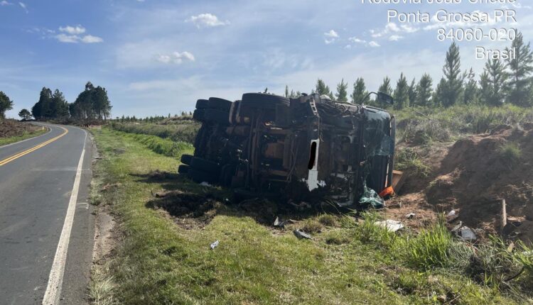 Caminhão tomba na PR-151, em Ponta Grossa, e motorista é encaminhado ao hospital