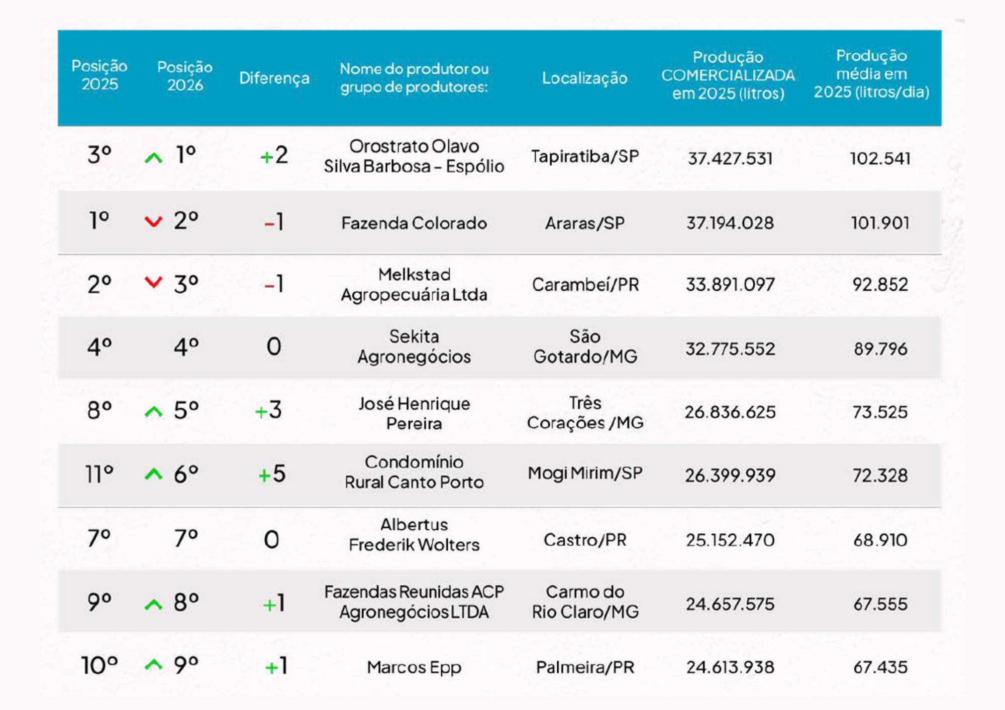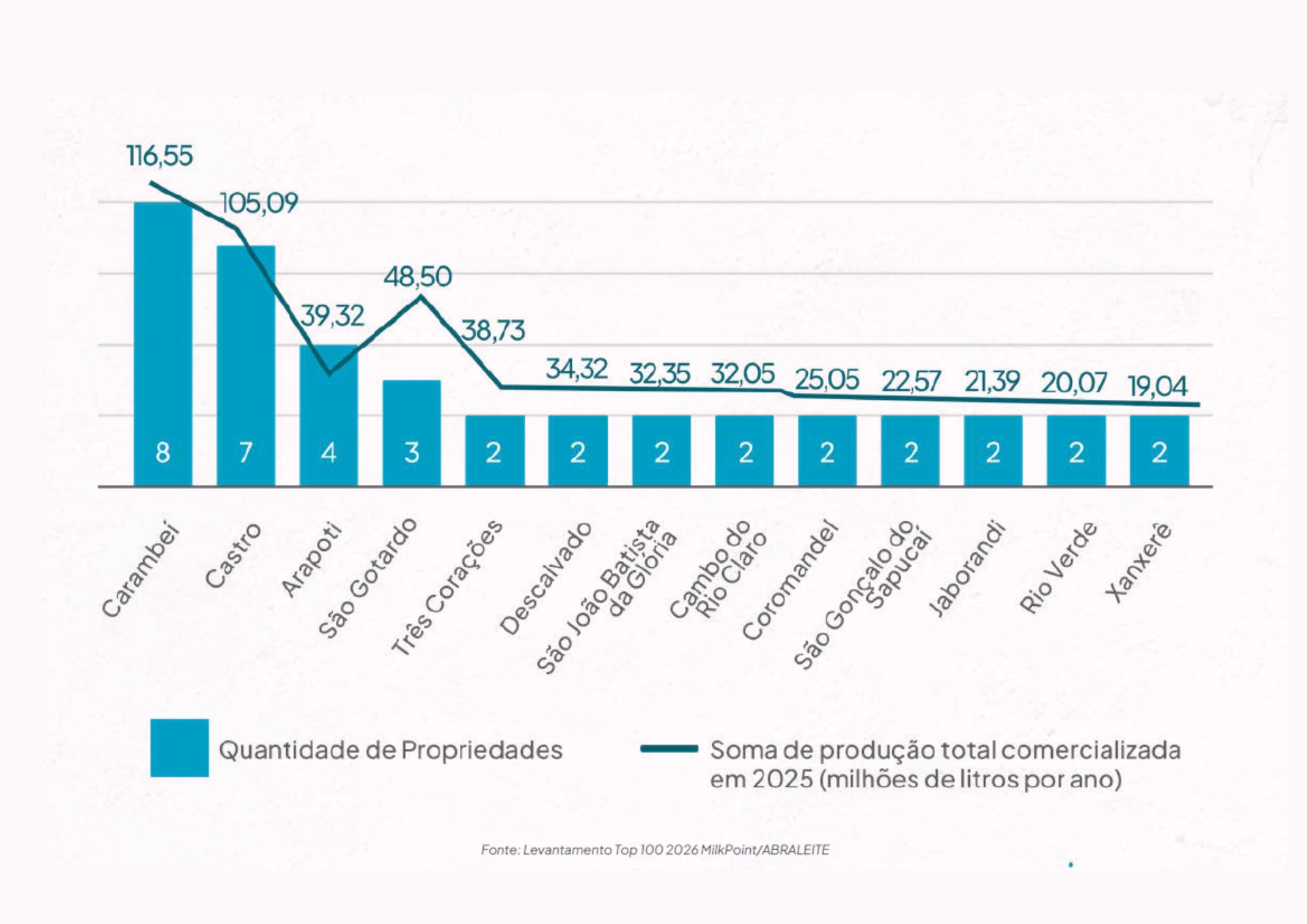 Carambeí retomou a liderança nacional, com oito propriedades entre as maiores do Brasil, enquanto Castro aparece na segunda posição, com sete fazendas. Juntos, os dois municípios somaram mais de 221 milhões de litros de leite produzidos em 2025, o equivalente a mais de 17% de todo o volume registrado no ranking.