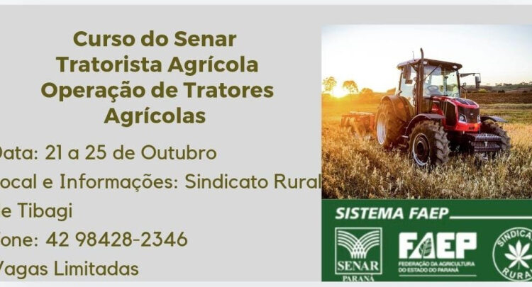 O Sindicato Rural de Tibagi está com inscrições abertas até sexta-feira (18), para o curso do Senar-PR de ‘Tratorista Agrícola e Operação de Tratores Agrícolas’. As aulas vão acontecer de 21 a 25 deste mês, não haverá custo, mas as vagas são limitadas.