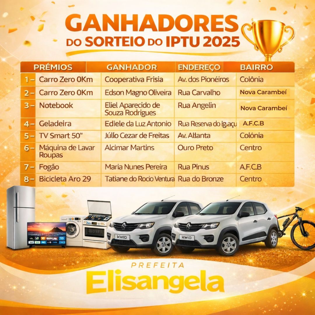 A prefeita Elisangela Pedroso destacou que a campanha superou as expectativas e reforçou o compromisso da administração com a transparência e a valorização da população. “Essa edição do IPTU Premiado superou as nossas expectativas. Foram dois carros e mais seis prêmios, em um ano diferente, pensado especialmente para prestigiar as pessoas que mantiveram o IPTU em dia, em comemoração aos 30 anos da nossa cidade. Ficamos muito felizes com a participação da população. Todo o processo seguiu o que determina a legislação, garantindo transparência e credibilidade à campanha”, afirmou a prefeita.