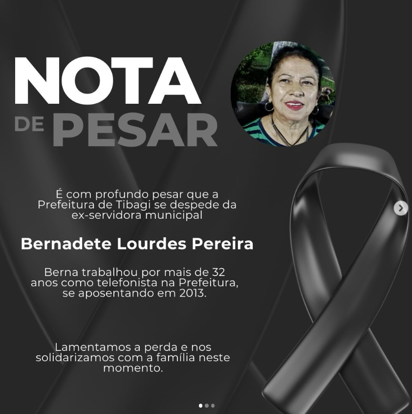 Por meio das redes sociais, a Prefeitura de Tibagi divulgou nota de pesar, destacando a trajetória e o legado deixado pela ex-servidora. Na manifestação, a administração municipal ressaltou o profissionalismo, a simpatia e o compromisso de Bernadete com a população, além de expressar solidariedade aos familiares, amigos e colegas neste momento de luto.