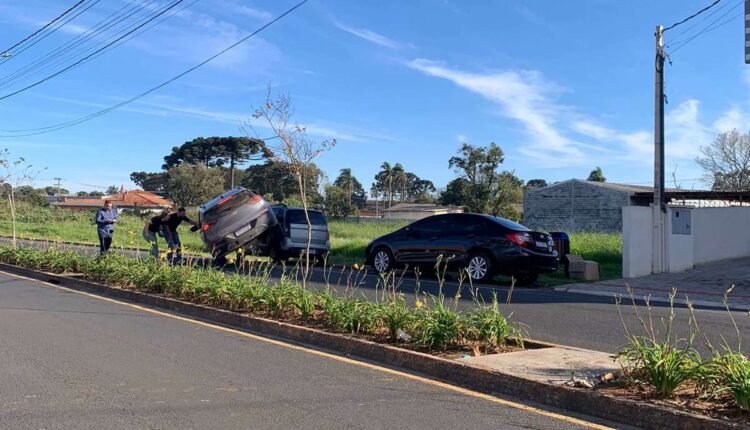 Carambeí – Na manhã desta quarta-feira (24), um acidente incomum chamou a atenção de motoristas e pedestres na Avenida do Ouro, em frente à nova agência da Caixa Econômica Federal. Dois automóveis se envolveram na colisão, resultando em uma cena que atraiu a curiosidade de quem passava pelo local.