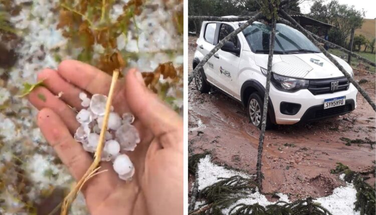 (Assista ao vídeo) Chuva de granizo em Piraí do Sul destrói 100 hectares de soja, atinge granjas, e derruba pinheiro em automóvel