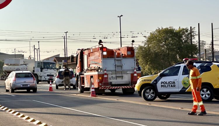 Carambeí – Acidente envolvendo um caminhão e um Fiat Mobi no início da manhã desta quarta-feira (24) deixou três pessoas feridas na Avenida das Flores, em Carambeí. Segundo informações preliminares, o caminhão tentava acessar uma rua lateral quando foi atingido pelo Mobi, que tentava uma ultrapassagem. Com o impacto, o carro capotou cerca de três vezes antes de parar.
