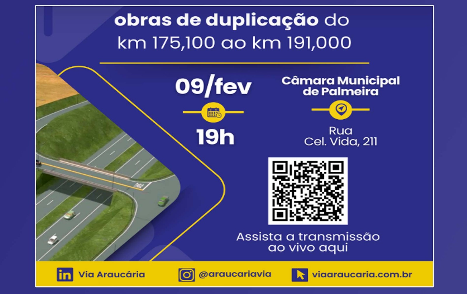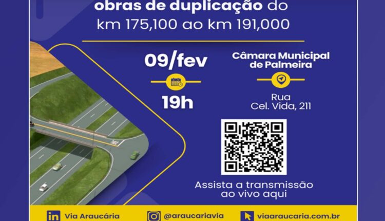 Palmeira – A Concessionária Via Araucária realizará, na segunda-feira (9), uma reunião pública em Palmeira para tratar do licenciamento ambiental e apresentar detalhes das novas etapas das obras de duplicação da BR-277. O encontro será realizado às 19h, na Câmara Municipal, e é aberto à participação de moradores, lideranças comunitárias, autoridades locais e demais interessados.