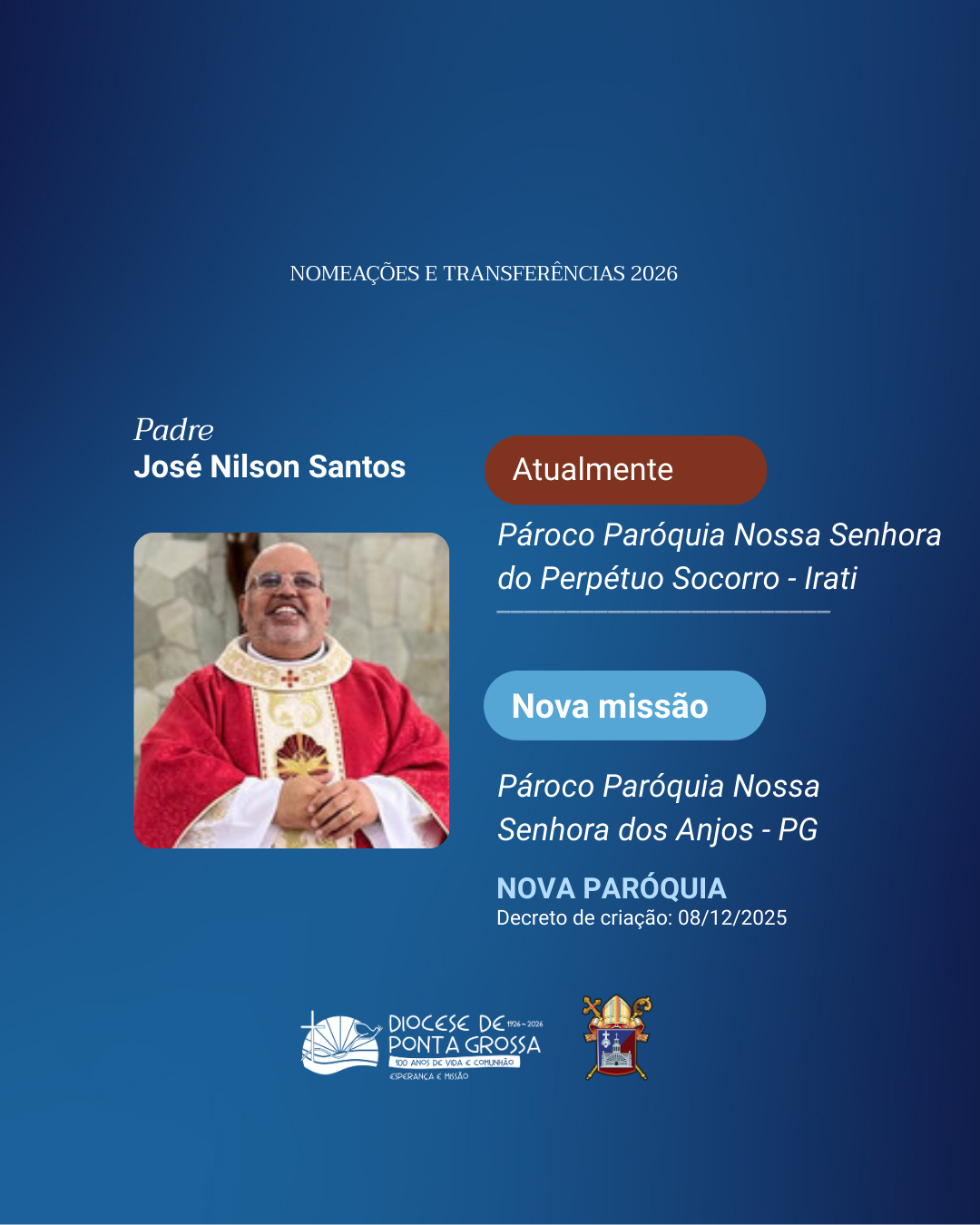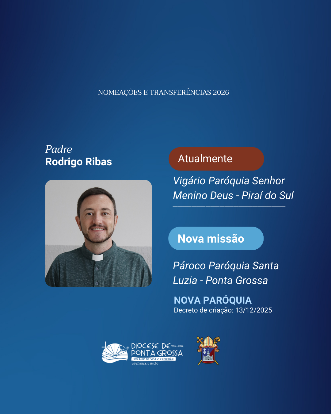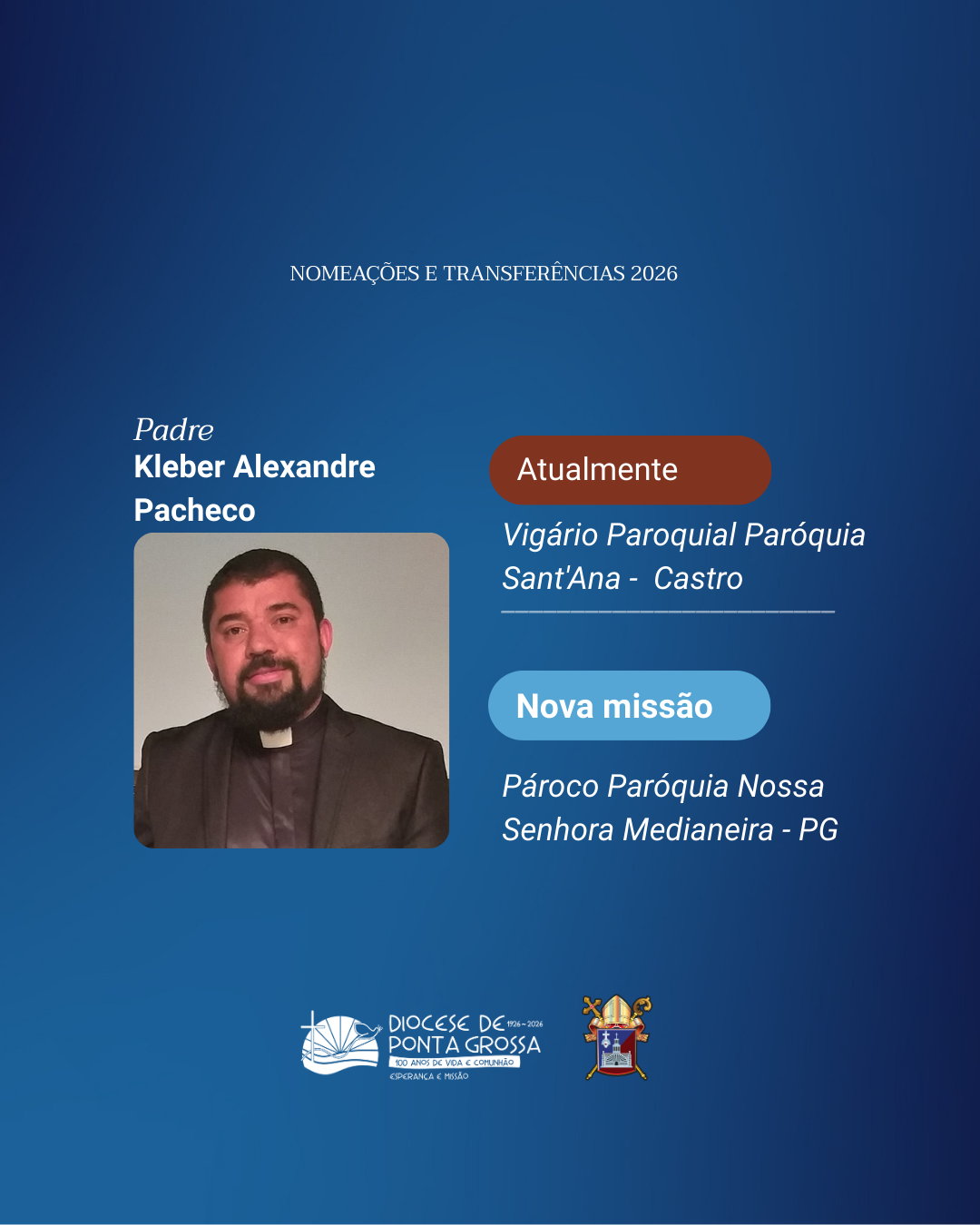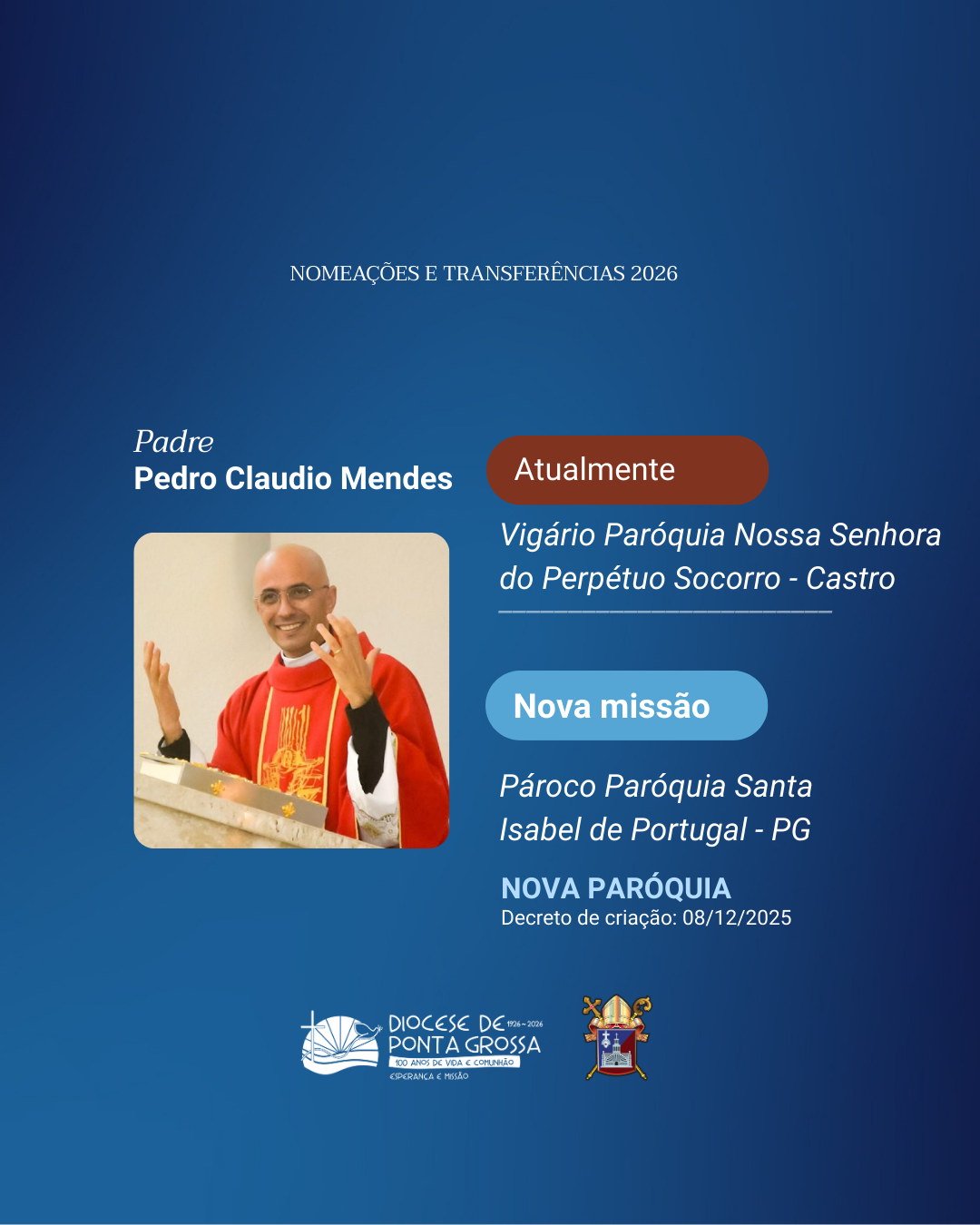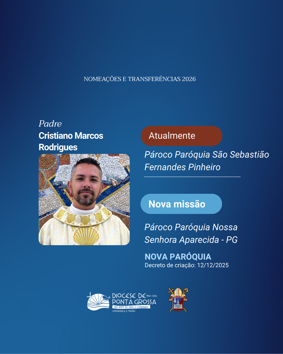 Vivemos um momento de graça na Diocese de Ponta Grossa: mudanças no clero, novos desafios e a expansão da estrutura paroquial, tudo guiado pelo desejo de servir ao povo com mais proximidade e carinho. Que cada mudança seja acolhida com fé e esperança, percebendo ao pastor que chega o dom de Deus, e à comunidade uma oportunidade de renovação espiritual e missão conjunta.