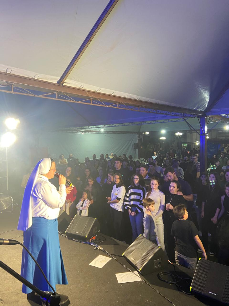 As religiosas foram recebidas pelo padre pároco Eloir e estiveram acompanhadas de um grupo de seis músicos ligados à congregação, incluindo a Irmã Marizele, que conduziu um momento de pregação, e o João Paulo, primeiro graduado da Copiosa Redenção, que compartilhou seu testemunho de sobriedade. O evento também contou com a presença da postulante Ketlyn, do Irmão Luiz Felipe, de Fernando Lopes e sua esposa, leigos consagrados que participaram ao lado do filho pequeno, além de João Paulo e sua esposa.