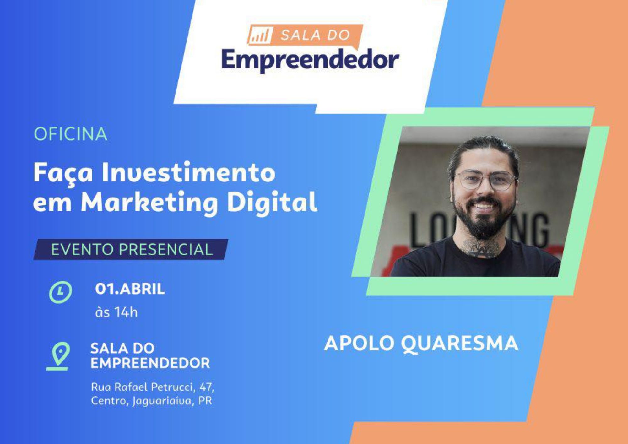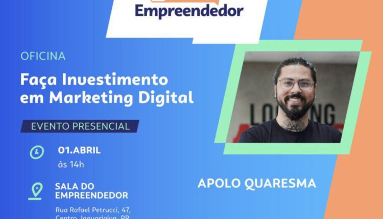 Jaguariaíva – A Sala do Empreendedor realiza, no próximo dia 1º de abril, às 14h, a oficina “Faça Investimento em Marketing Digital”, voltada a empreendedores e interessados em aprimorar estratégias de divulgação online. O evento será presencial e acontecerá na sede do órgão, localizada junto ao Departamento de Ensino Profissionalizante, na Rua Rafael Petrucci, nº 47, no Centro do município.
