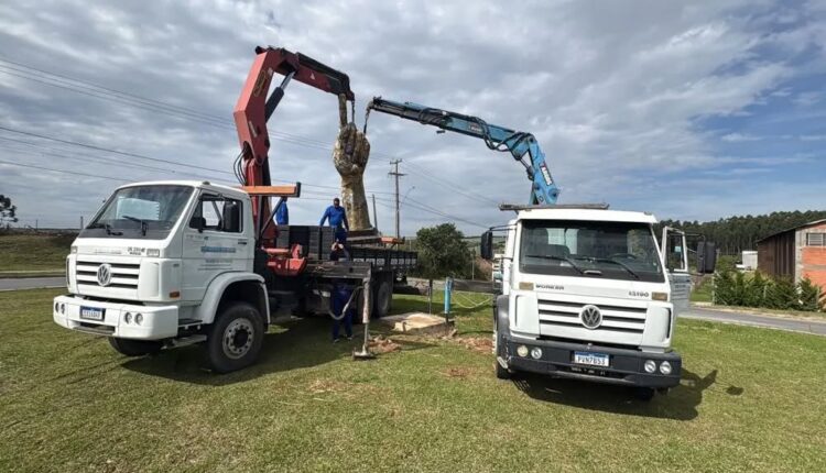 Palmeira – A Prefeitura Municipal retirou o monumento conhecido popularmente como ‘Estátua do Dedo’, que ficava instalado na rotatória da Avenida Daniel Mansani, nas proximidades da BR-277. A escultura, que há anos fazia parte da paisagem local, foi transferida na quarta-feira (23) para o Solar Conselheiro Jesuíno Marcondes, onde passará a integrar o acervo do Museu Histórico da cidade.