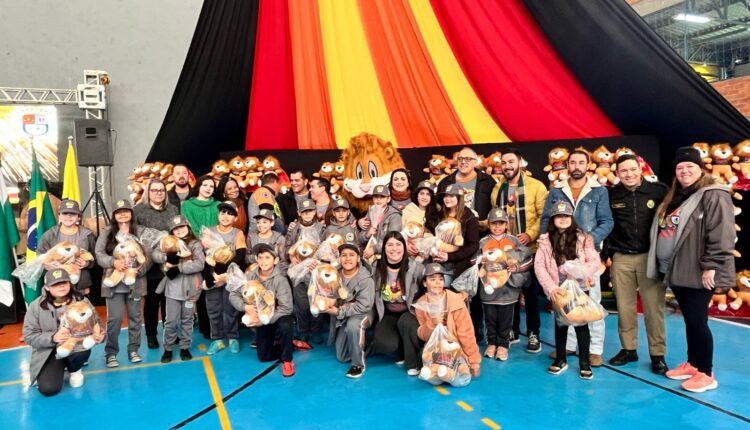 Durante a formatura, os alunos receberam os tradicionais kits do Proerd, compostos por uma camiseta, um boné e o mascote da campanha — o leãozinho “Daren” — símbolo do compromisso com uma vida longe das drogas.