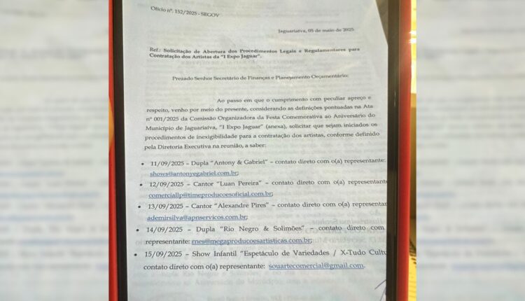 Jaguariaíva – Um suposto ofício da Secretaria Municipal de Governo de Jaguariaíva (Segov), datado de 5 de maio, tem circulado nas redes sociais nesta semana. O documento, identificado como Ofício nº 152/2025 – da Segov, solicita a abertura dos procedimentos legais para a contratação de artistas para a ‘1ª Expo Jaguar’, evento em comemoração ao aniversário do município.