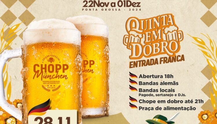 Começa nesta quarta-feira (11), às 18 horas, a venda de ingressos para a 33ª Münchenfest, a Festa Nacional do Chope Escuro de Ponta Grossa. O evento vai de 22 a 24 de novembro (sexta a domingo) e 27 de novembro a 01 de dezembro (quarta a domingo) no Centro de Eventos. A realização é da Drial Eventos e Prefeitura de Ponta Grossa, com produção da IT´s Produções.