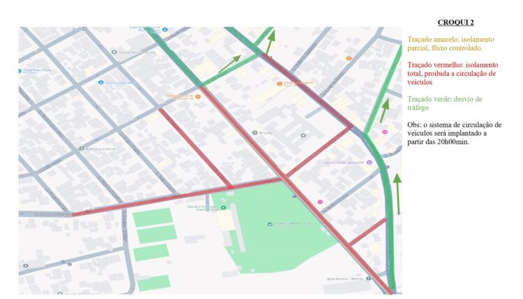 A PM informou que partes das ruas Freire Alemão, Nilo Peçanha, Carlos de Laet e Fernando de Noronha serão bloqueadas, com sinalização em vermelho no esquema de trânsito. A Rua Emílio de Menezes sofrerá interdição parcial e controle de fluxo, indicada em amarelo.