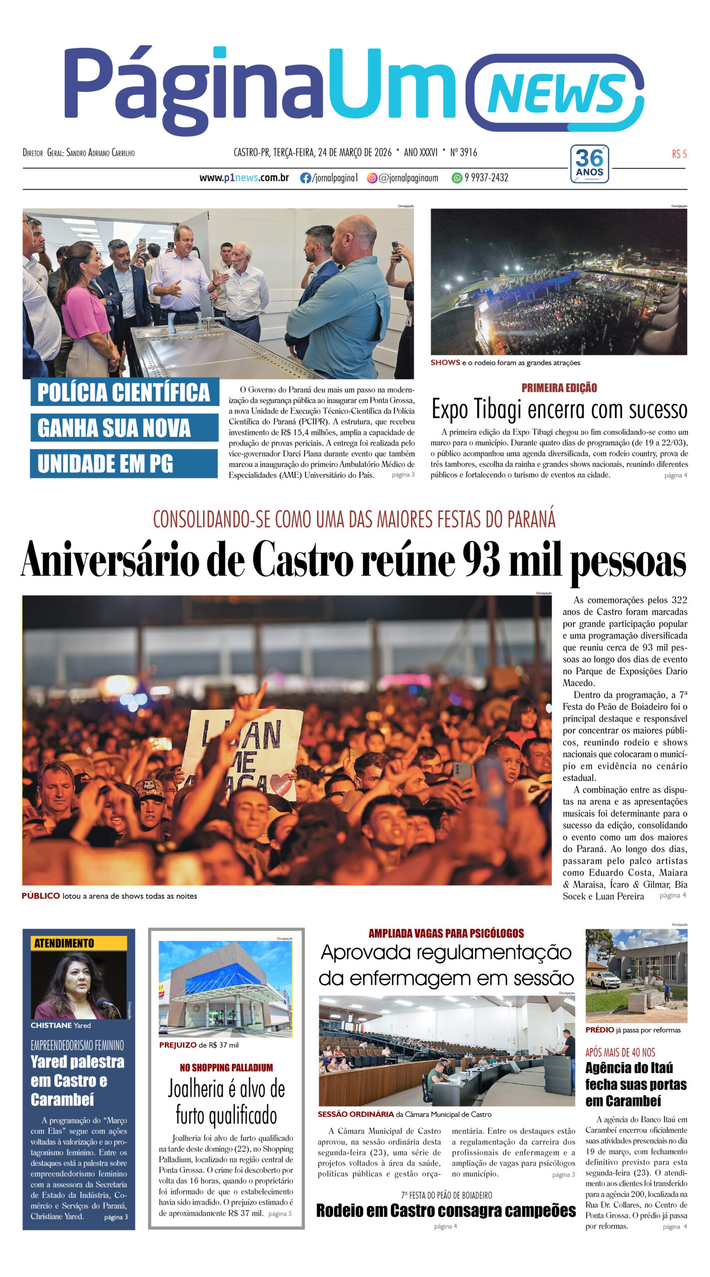 EDIÇÃO 3916 Impresso By Redação Página 1 On 23 mar, 2026 Share Participe do grupo no WhatsApp do PáginaUm News e receba as principais notícias dos campos gerais direto na palma da sua mão. ENTRE NO GRUPO. Share