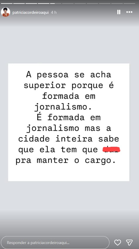 Em resposta à reportagem do P1 News, a blogueira e ex-candidata a vereadora Patrícia Cordeiro afirmou que as publicações feitas em suas redes sociais não tinham como alvo direto a jornalista, pois, segundo ela, naquele momento não sabia quem administrava o perfil do prefeito Dr. Reinaldo Cardoso, de onde partiram as mensagens.