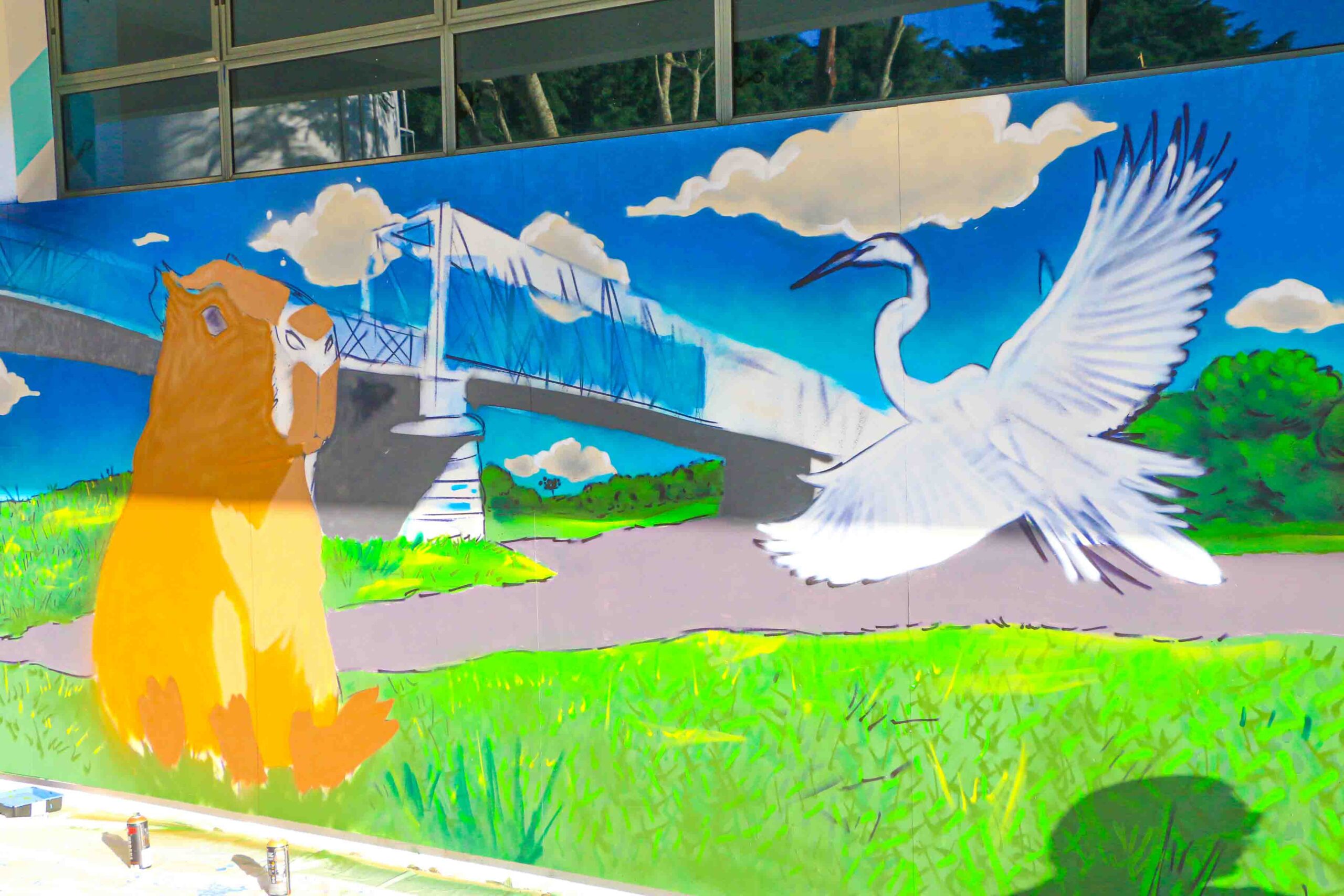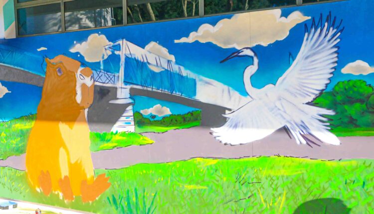 “Nós escolhemos a arte juntos. Quisemos uma capivara, uma garça, e também a pessoa com a plantinha, que simboliza as raízes do futuro, ligado à entrega de mudas que fizemos”, explica Yasmim Sleutjes, secretária da Juventude de Castro.