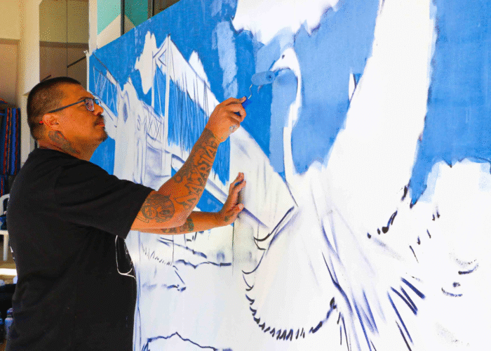 ‘Sete’ é um dos artistas contemplados por edital da Itaipu Binacional, que financia sua atuação em diferentes cidades do Paraná e de outros estados. Em cada localidade, ele pesquisa os elementos da cidade, cria o desenho no digital, esboça na parede e conduz a pintura coletivamente com os participantes. “Eu recebo as informações, faço as pesquisas, crio primeiro no digital, depois esboço e as crianças me ajudam a pintar”, explica.