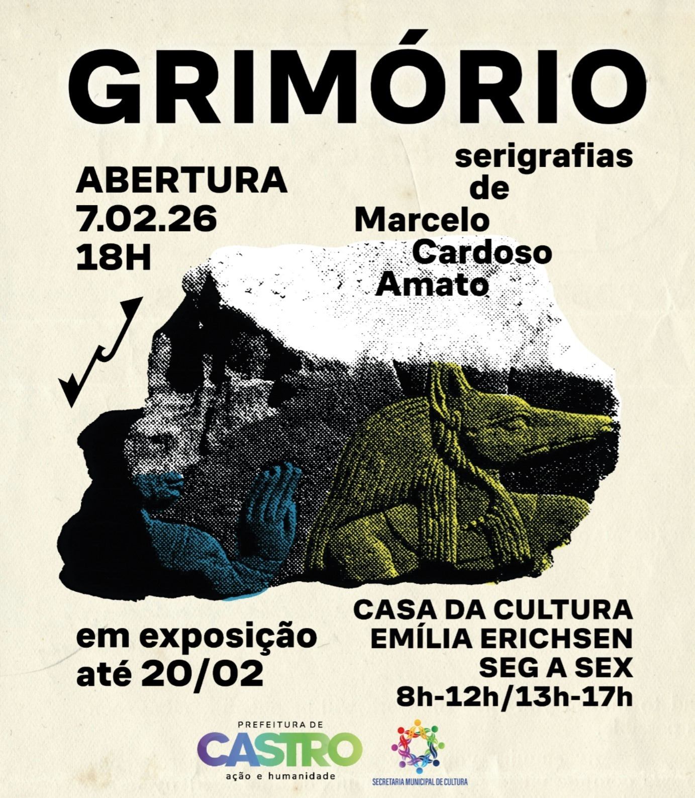 Castro – A Casa da Cultura Emília Erichsen recebe, a partir deste sábado (7), a exposição Grimório, do artista visual castrense Marcelo Cardoso Amato. A abertura ocorre às 18h, e a mostra permanece em cartaz até o dia 20 de fevereiro, com visitação gratuita durante o horário de funcionamento do espaço cultural.