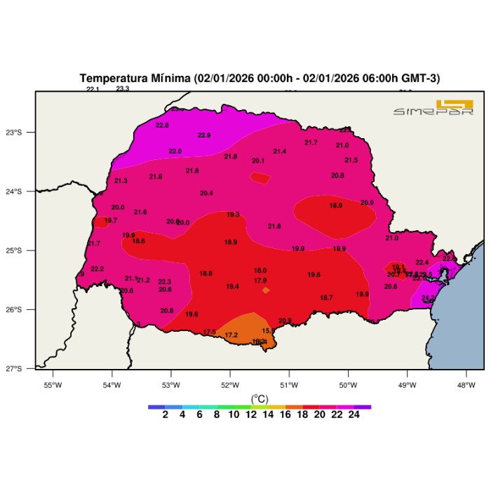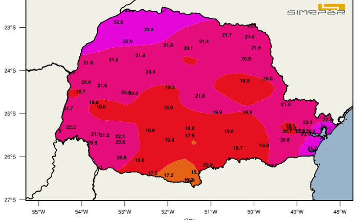 Os índices de instabilidade permanecem elevados e favorecem a ocorrência de chuvas pontualmente intensas e temporais isolados. As temperaturas já apresentam mudança em parte do Estado, especialmente nos municípios mais ao Sul. Cidades como General Carneiro, Palmas e Guarapuava registraram marcas próximas de 17 °C nas primeiras horas do dia.