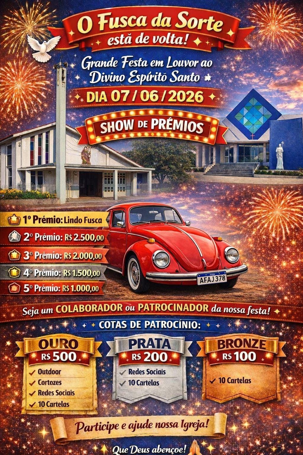 O novo sorteio do veículo está previsto para acontecer no dia 7 de junho de 2026, durante a Festa do Divino Espírito Santo, promovida pela Paróquia São Judas Tadeu, em Castro. A programação inclui missa festiva, almoço com churrasco, bingos, leilão e o tradicional show de prêmios, que terá o Fusca 1972 como principal atração.