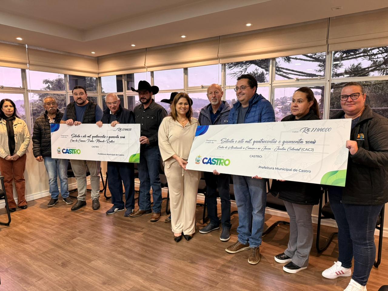 Castro – A venda de ingressos para os camarotes e os valores das taxas cobradas na praça de alimentação da 6ª Festa do Peão de Boiadeiro de Castro, realizada em março deste ano, renderam R$ 154.880,00 em recursos que agora vão ajudar duas entidades sociais de Castro na manutenção de atividades voltadas a pelo menos 750 crianças e adolescentes. A entrega dos cheques simbólicos, de R$ 74.440,00 cada, para a Casa da Criança e do Adolescente Padre Marcelo Quilici, da Associação Antonio e Marcos Cavanis, e para o Centro de Atendimento à Criança e ao Jovem (CACJ), aconteceu na manhã desta sexta-feira (03) no Salão de Atos da Prefeitura.