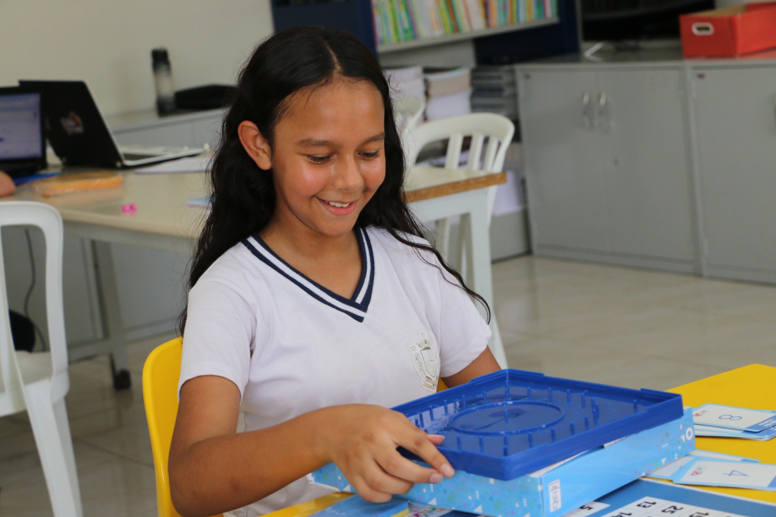 Maria Sofia Oliveira da Silva, aluna do 5º ano no Dalila, comemorou a chegada dos jogos. “Eu gosto de aprender o que tem na matemática e acho interessante as outras formas de aprender, de fazer brincadeiras e jogos que envolvem a matemática”.