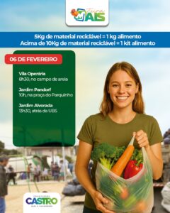 Castro – A Prefeitura de Castro retoma, nesta quinta (5) e sexta-feira (6), o Feira Mais, programa que troca materiais recicláveis por alimentos e que já se consolidou como uma das principais ações de educação ambiental e incentivo à economia familiar rural no município.
