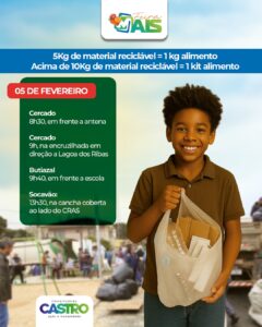 Castro – A Prefeitura de Castro retoma, nesta quinta (5) e sexta-feira (6), o Feira Mais, programa que troca materiais recicláveis por alimentos e que já se consolidou como uma das principais ações de educação ambiental e incentivo à economia familiar rural no município.