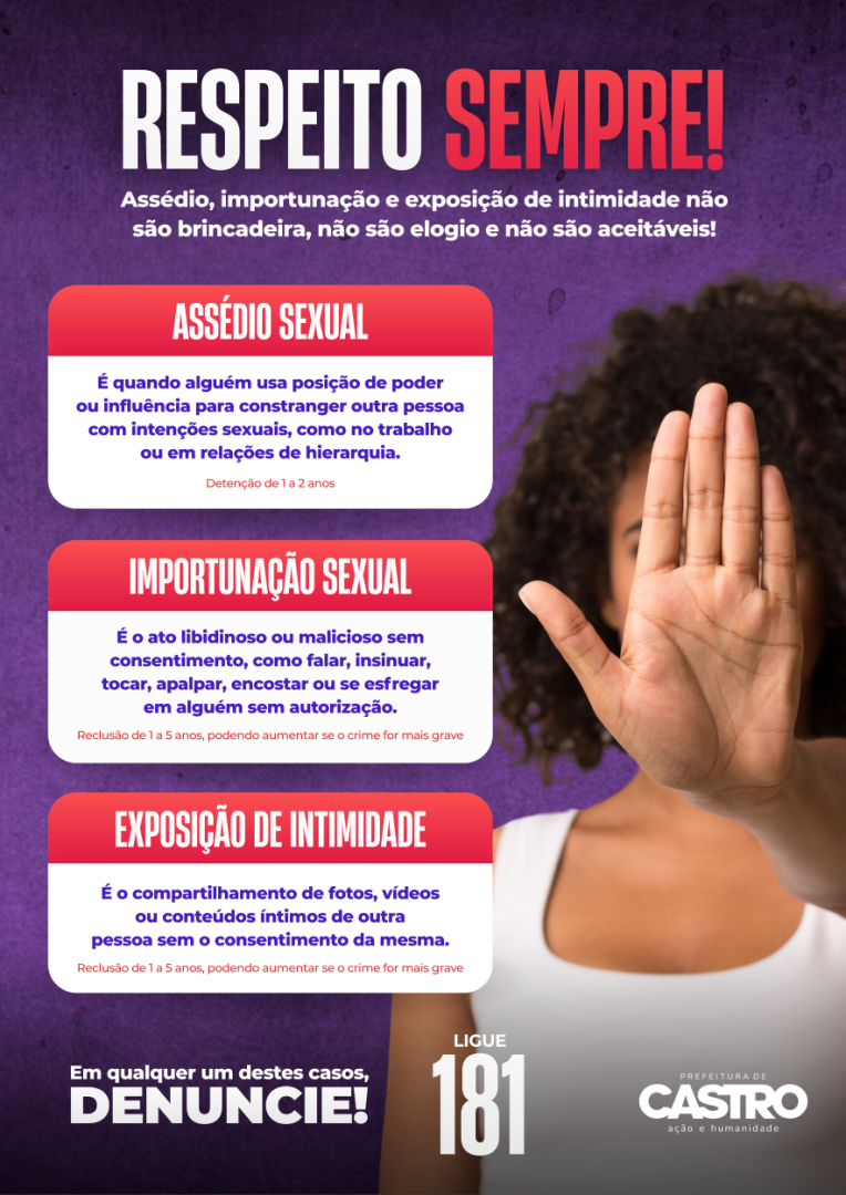 Castro – A Prefeitura de Castro lançou nesta semana uma campanha de conscientização e combate ao assédio sexual, à importunação sexual e à exposição de intimidade. A ação busca informar a população e reforçar a importância do respeito em todos os ambientes, especialmente nos espaços públicos e de atendimento.