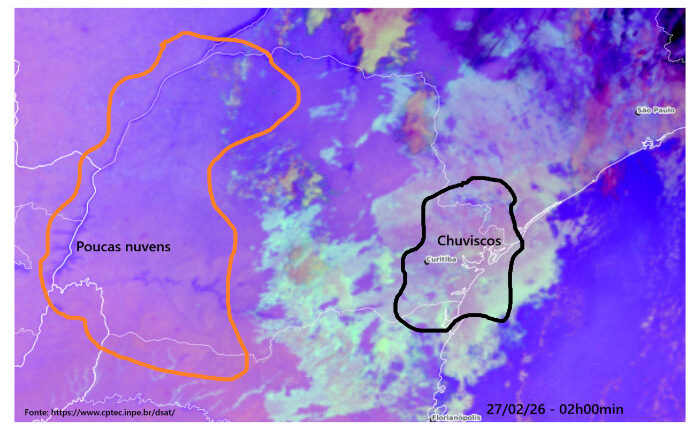 Durante a madrugada, o céu permaneceu encoberto na faixa leste do Paraná, com registro de garoa e chuviscos ocasionais. Nos Campos Gerais e no Norte do Estado, a nebulosidade também predomina nas primeiras horas do dia. Já nas demais regiões, o céu apresenta poucas nuvens.