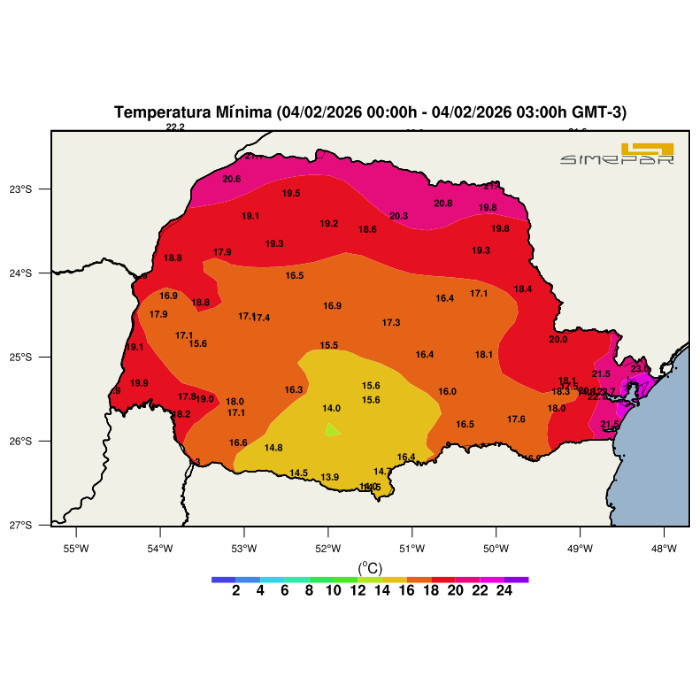 Segundo a especialista, em outras regiões paranaenses as temperaturas mínimas foram mais elevadas. “No oeste, noroeste e norte, as mínimas ficaram entre 17 °C e 19 °C. Já no litoral e no extremo nordeste, os termômetros superaram os 20 °C, em função da maior disponibilidade de calor, da circulação marítima e da menor eficiência do resfriamento radiativo”, completou.