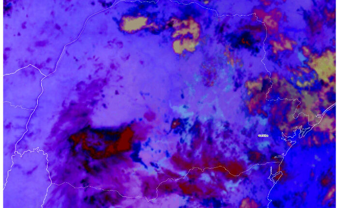 Ao longo da madrugada, as chuvas perderam força e se dissiparam, permanecendo apenas a presença de muitas nuvens em várias regiões do estado. O cenário foi registrado por imagens de satélite do GOES-19, por meio do produto Nighttime Microphysics.