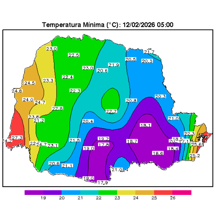 Na análise do cenário estadual, o Simepar aponta que a madrugada foi marcada por maior nebulosidade da faixa central até o Norte Pioneiro, onde foram registradas pancadas de chuva fraca. Apesar disso, a cobertura de nuvens se manteve pouco densa, com predomínio de céu limpo na maior parte do Paraná.