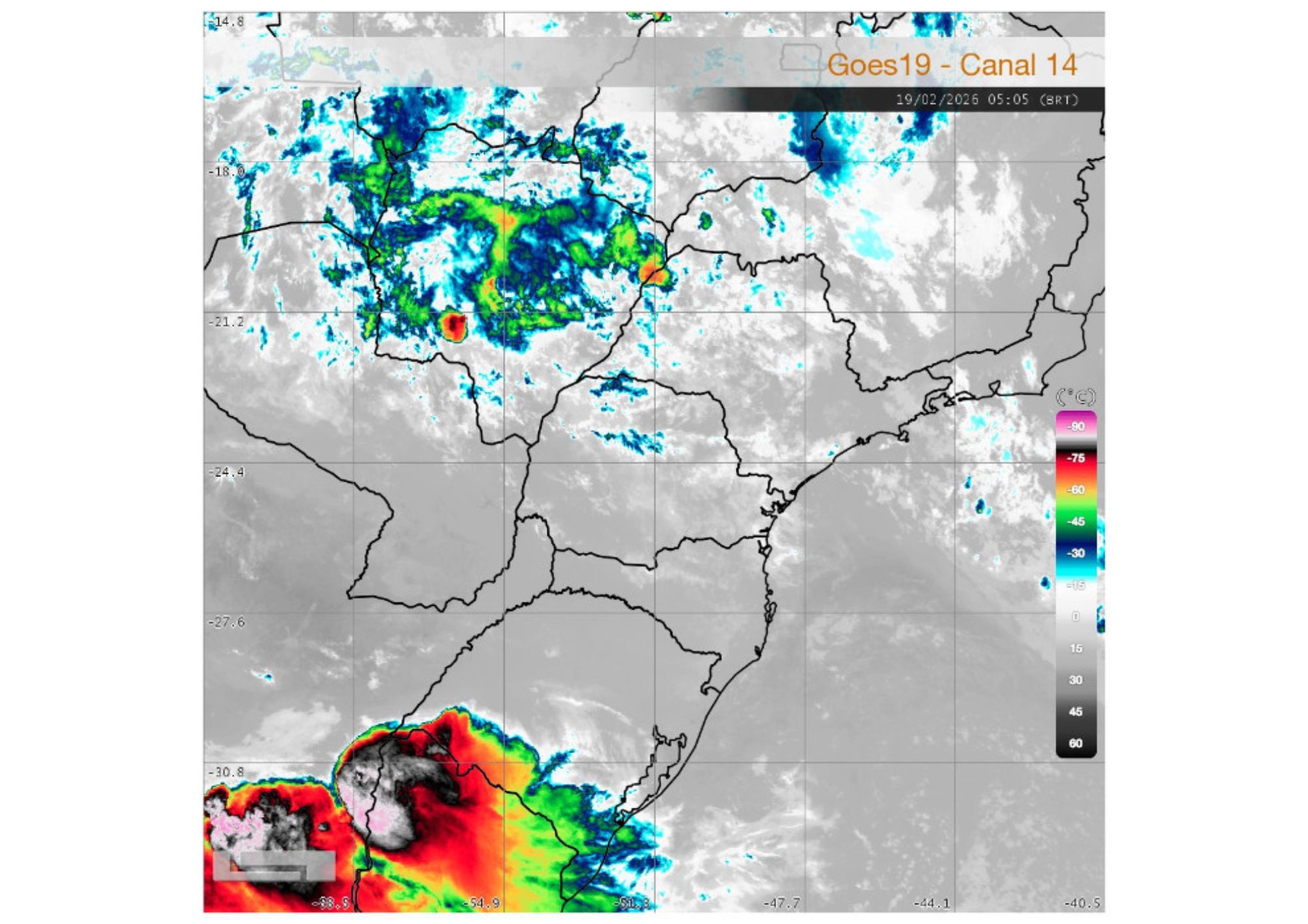 Enquanto isso, o cenário é bem diferente no Centro-Leste da Argentina e no Uruguai. A atuação de um cavado meteorológico em altitude — sistema que favorece a queda de pressão e a formação de tempestades — associada ao calor e à alta umidade, mantém o ambiente extremamente instável na região.