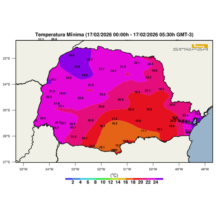 Já no Litoral, Oeste e Noroeste, a madrugada foi de forte abafamento, com temperaturas mínimas acima dos 23°C a 24°C em diversos municípios.