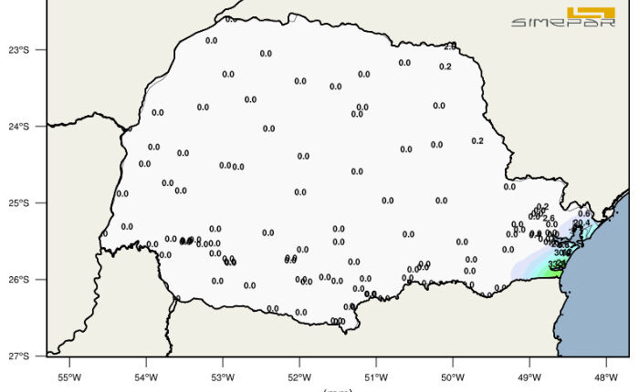 Temperaturas variam entre 16°C e 26°C; enquanto o Interior tem tempo firme, litoral do Paraná registra chuva intensa durante a madrugada, aponta o Simepar.