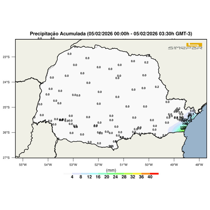 Enquanto o Interior do Estado segue com tempo mais firme, o litoral do Paraná registrou chuva persistente e localizada durante a madrugada, conforme explica a meteorologista do Simepar, Bianca Pinheiro de Angelo. Segundo ela, os pluviômetros apontaram acumulados significativos entre 0h e 3h30, com destaque para Guaratuba (33,2 mm), Matinhos (24,4 mm) e Guaraqueçaba (20,4 mm).