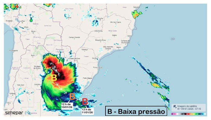 A área de menor pressão atmosférica deve atingir principalmente o Uruguai e o sul do Rio Grande do Sul, conforme estimativas de posicionamento do sistema para o meio-dia dos dias 10 e 11 de janeiro de 2026. No Paraná, os efeitos serão sentidos por meio da frente fria associada a esse ciclone, um padrão considerado comum nesse tipo de situação.