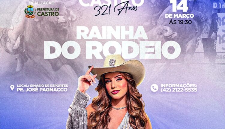 Castro – Já está no site da Prefeitura o regulamento do concurso que vai escolher a Rainha, Princesas e Madrinha dos Peões da 6ª Festa de Peão de Boiadeiro de Castro. As inscrições começam dia 17 de fevereiro e devem ser feitas presencialmente no Espaço Cultural Vicente Machado (Praça Manoel Ribas, 170), até dia 28 de fevereiro. A eleição das majestades acontecerá dia 14 de março e a Festa, em comemoração aos 321 anos de Castro, entre dias 19 e 22 de março.