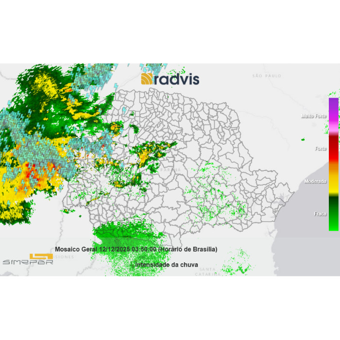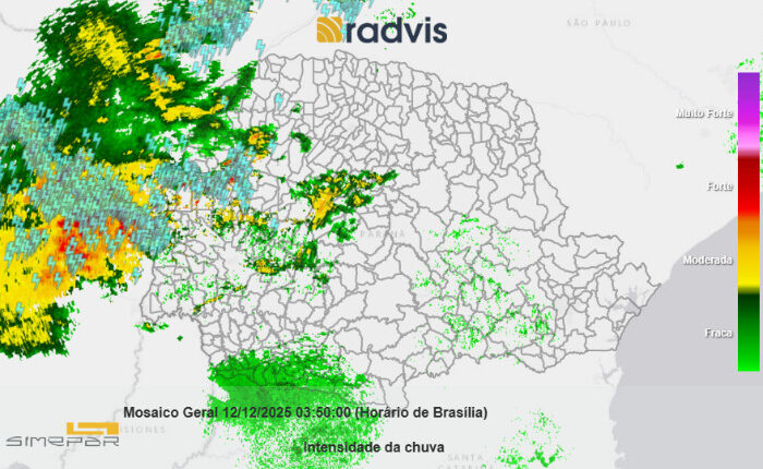 A meteorologista do Simepar, Júlia Crepaldi Munhoz, explica que o sistema já podia ser observado durante a madrugada. “A instabilidade já atua na metade oeste do Paraná, como pode ser observado na imagem de satélite, extraída do mosaico de radares do Simepar, acompanhada das identificações de descargas atmosféricas. As áreas de chuva ocorrem de forma localizada, com núcleos de diferentes intensidades — inclusive alguns apresentando forte intensidade”, afirma.