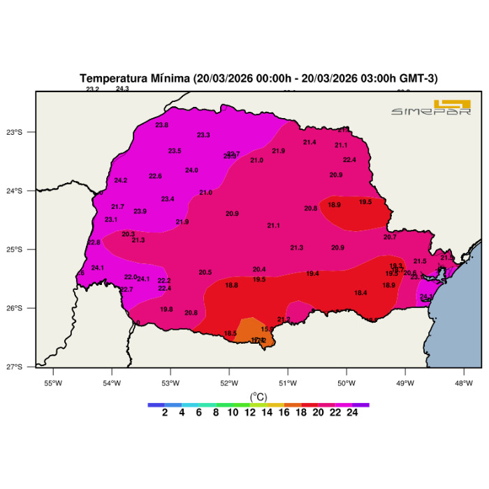 Castro – O verão chega ao fim nesta sexta-feira (20) com temperaturas mínimas elevadas em grande parte do Paraná. De acordo com o Sistema de Tecnologia e Monitoramento Ambiental do Paraná (Simepar), a madrugada foi marcada por calor atípico para o período, com registros predominantemente acima dos 20°C em diversas regiões do estado.