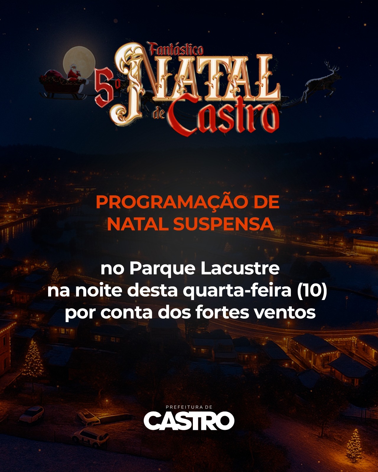 A Prefeitura de Castro cancelou a programação do 5º Fantástico Natal de Castro prevista para a noite desta quarta-feira (10), após ventos fortes danificarem parte da estrutura da decoração natalina instalada no Parque Lacustre. Segundo o município, a decisão foi tomada para garantir a segurança dos visitantes diante da instabilidade climática que atinge os Campos Gerais.