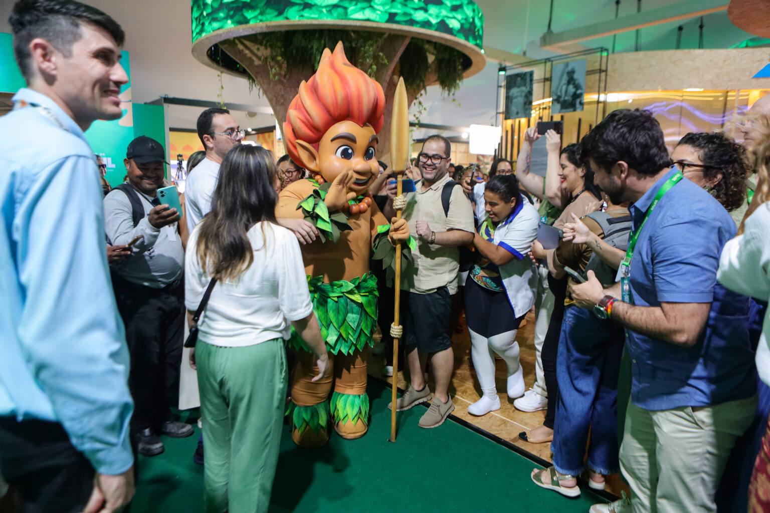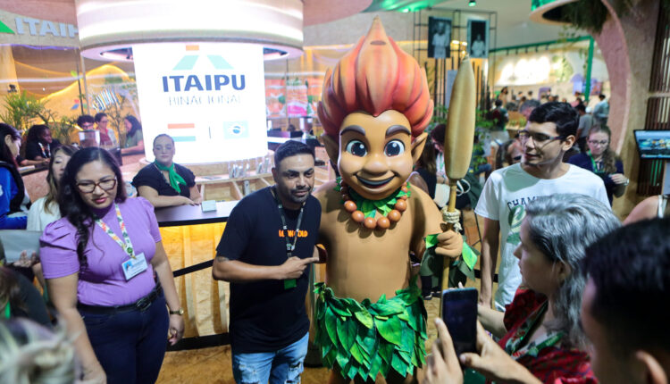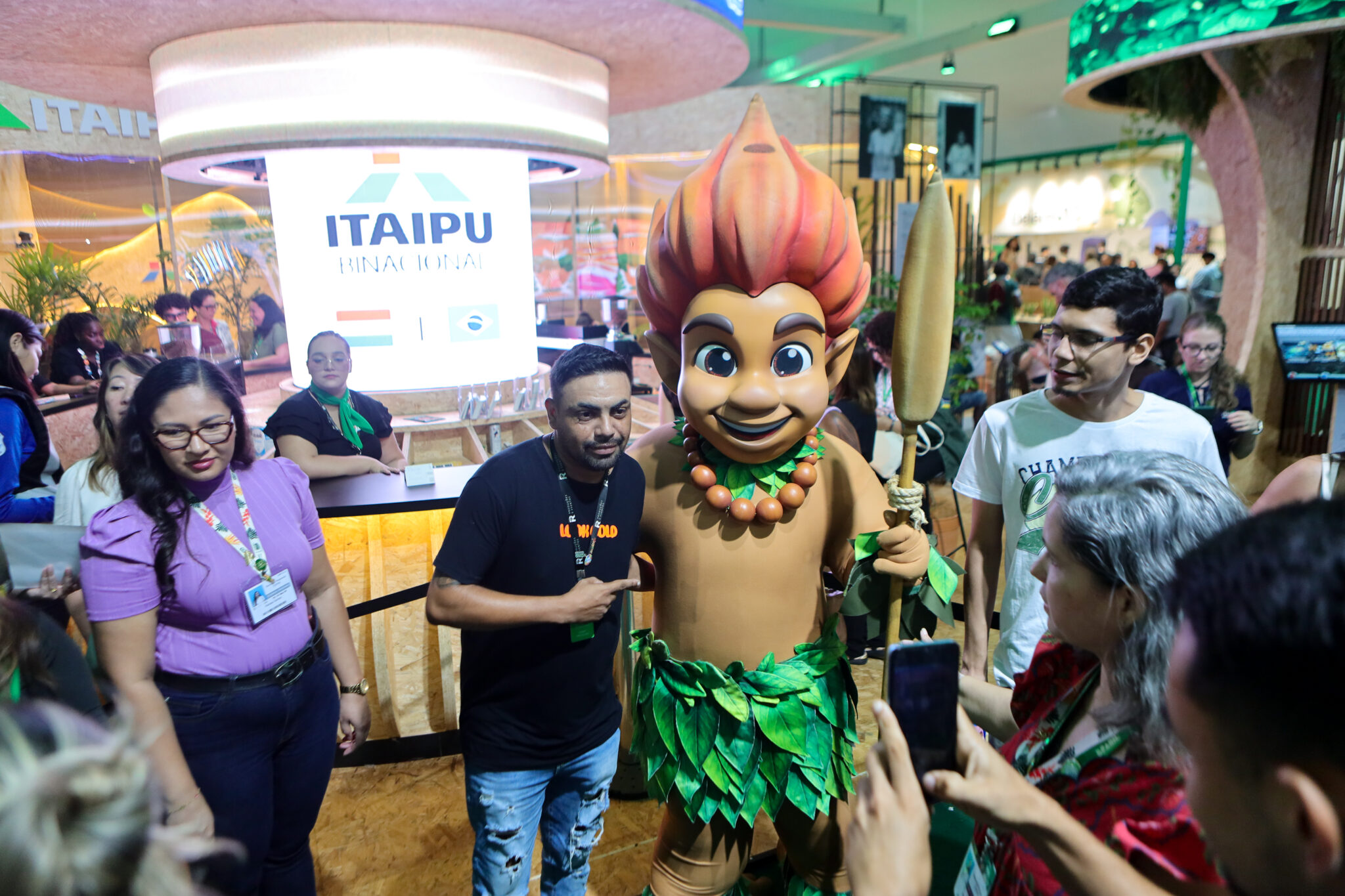 Curupira, Guardião da Floresta e mascote da COP30, visita estande da Itaipu