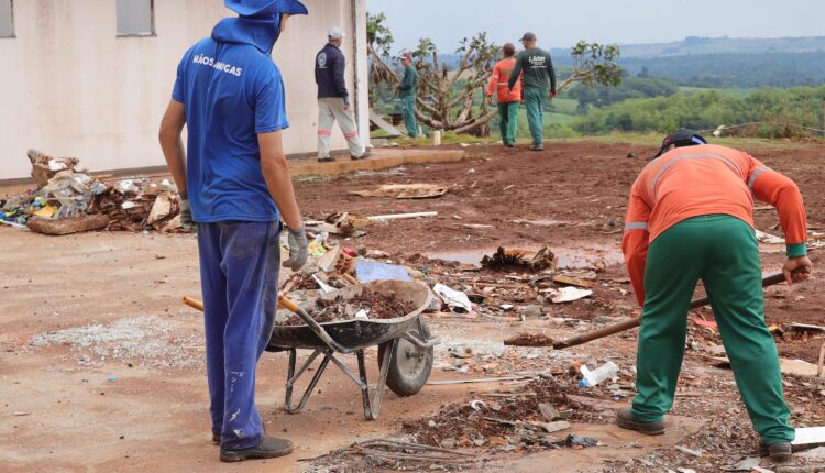 As equipes seguem atuando no Colégio Estadual Ludovica Safraider, a unidade mais atingida pelo tornado, onde continua a remoção de resíduos para liberar a área que será reconstruída. O mutirão também abrangeu a APAE do município, com ações de limpeza, organização e suporte para retomada das atividades, além do destacamento da Polícia Militar do Paraná (PMPR).