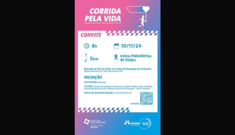 Foz do Iguaçu – Os(as) atletas de Foz do Iguaçu e região estão convidados para uma prova muito especial: a Corrida pela Vida, promovida pela Itaipu Binacional e o Hospital Ministro Costa Cavalcanti como parte da programação de outubro rosa e novembro azul, para a conscientização quanto à prevenção dos cânceres de mama e próstata.