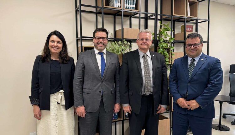 Curitiba – O diretor jurídico da Itaipu Binacional, Luiz Fernando Delazari, recebeu nessa quinta-feira (15) o presidente do Tribunal Regional Eleitoral do Paraná (TRE-PR), desembargador Sigurd Roberto Bengtsson, e o juiz eleitoral da 46ª Zona Eleitoral – Foz do Iguaçu, José Rodrigo Sade, no Centro Executivo da Itaipu.