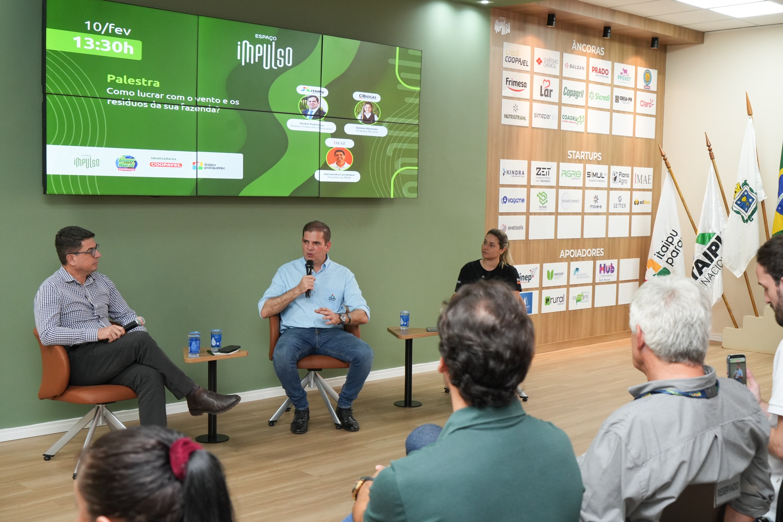 A primeira apresentação, “Como lucrar com o vento e os resíduos da sua fazenda”, teve a participação do diretor financeiro executivo da Itaipu Binacional, André Pepitone; da diretora técnica do Centro Internacional de Energias Renováveis (CIBiogás), Daiana Martinez, e do CEO da startup IMAE, Alessandro Lomônaco. A discussão abordou desde a história da geração distribuída no Brasil até as possibilidades concretas de aplicação de diferentes fontes renováveis no campo, aproveitando recursos já disponíveis no dia a dia do produtor rural.