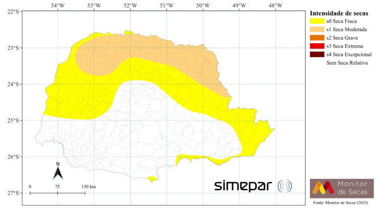 O documento mostra que houve recuo de até duas categorias de intensidade (de grave para fraca) no Sul e Sudoeste do Paraná – que agora ficaram sem seca relativa. Nestas regiões, a estiagem vinha se agravando todos os meses desde fevereiro. Já no Noroeste e Oeste do Paraná, a seca moderada recuou. O mapa paranaense, portanto, ficou com a metade sul sem seca, com uma faixa de seca fraca do Litoral até o Noroeste, e outra faixa, menor do que nos meses anteriores, de seca moderada na área de divisa com São Paulo.
