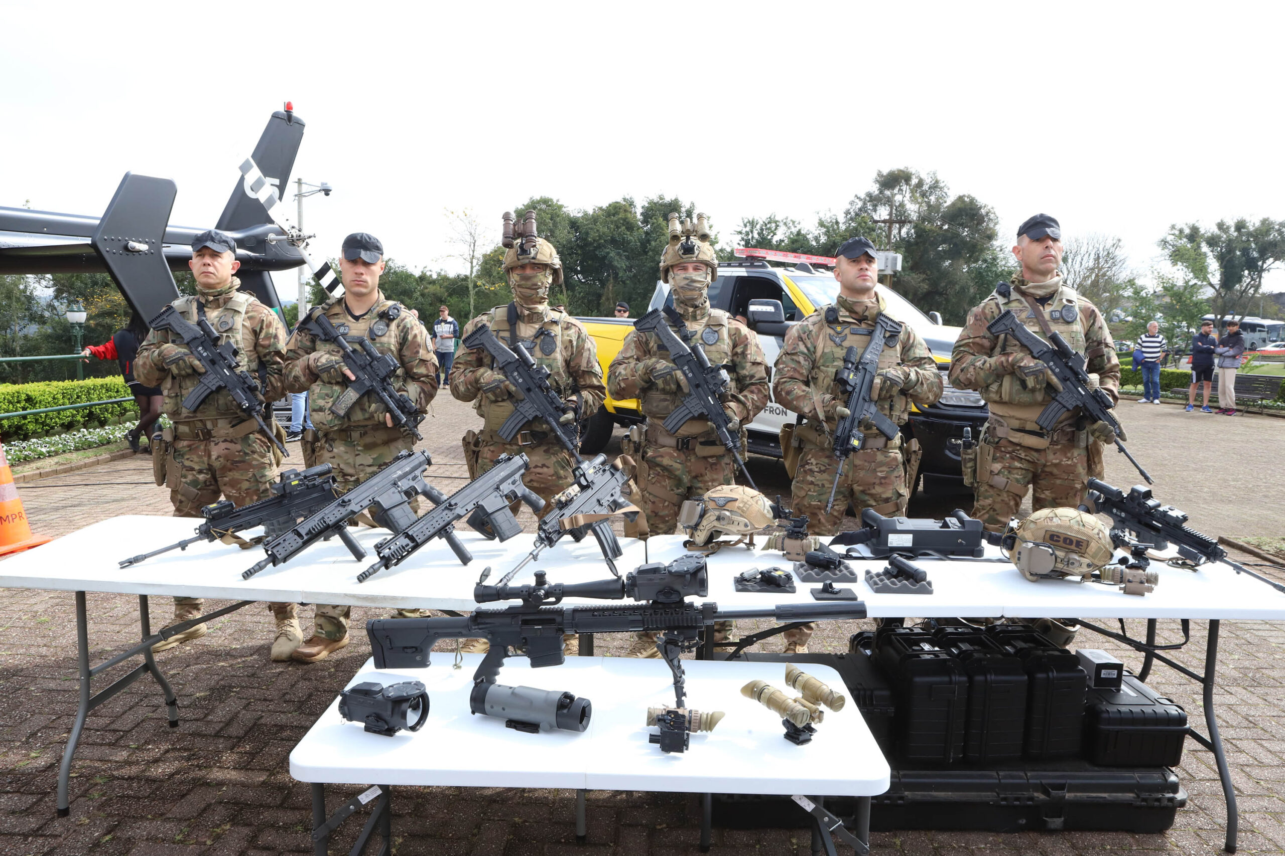 A entrega dos novos fuzis faz parte de um pacote superior a R$ 100 milhões entregue por Ratinho Junior nesta terça-feira e envolve cinco helicópteros, 35 caminhonetes RAM 3500 de grande porte, 56 viaturas L200, e equipamentos ópticos e táticos de última geração, como monóculos de visão noturna, designadores laser, miras de visão termal e sistemas de captação de imagens através de paredes.
