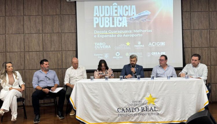 Curitiba – A ampliação e modernização do Aeroporto Municipal Tancredo Thomas de Faria, em Guarapuava, foi tema de uma audiência pública realizada nesta quinta-feira (27). O evento, sediado no Centro Universitário Campo Real, reuniu cerca de 100 pessoas, entre autoridades, empresários, representantes de entidades e membros da sociedade civil.